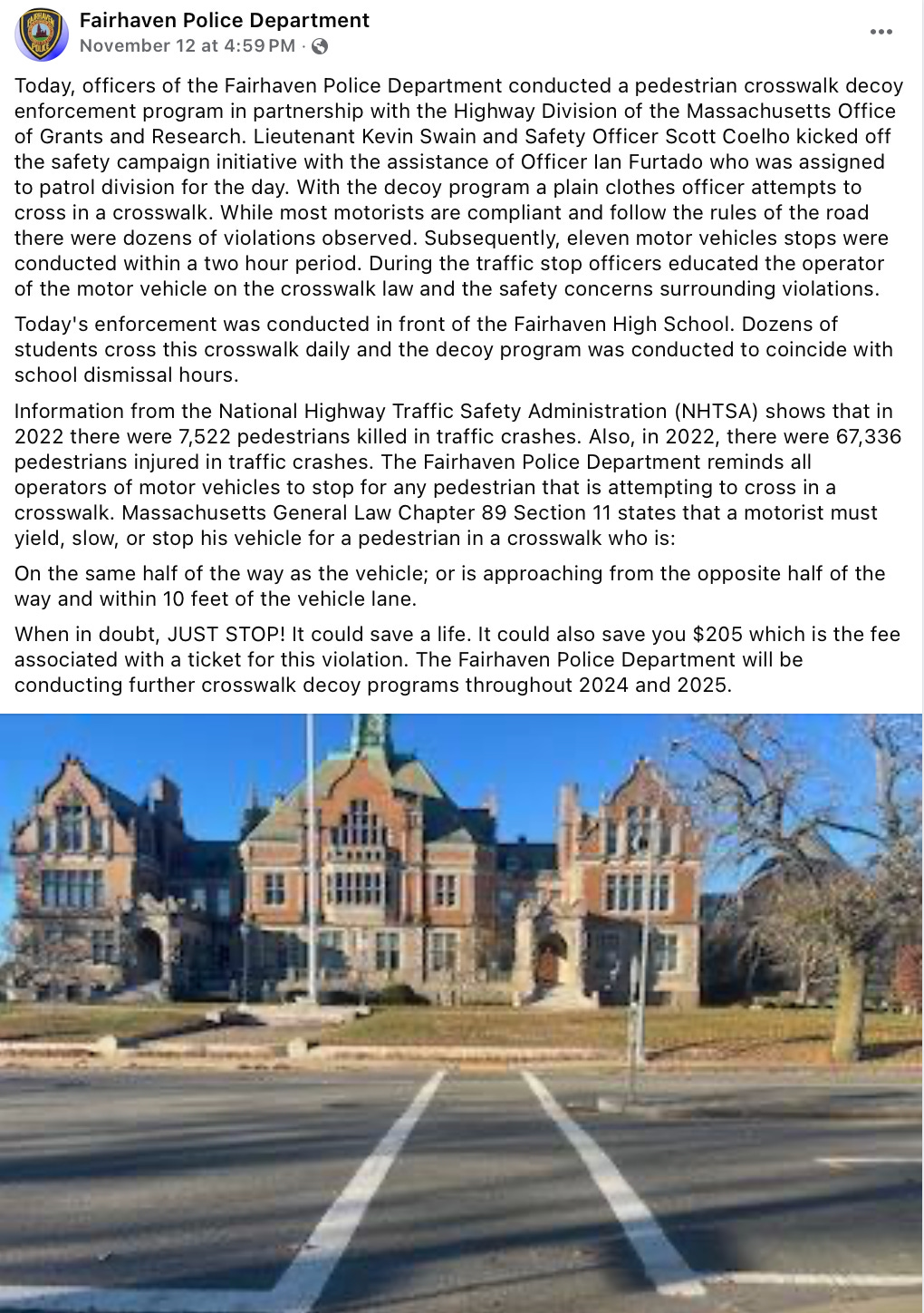 Under safety officer Scott Coehlo, Fairhaven PD has stepped up traffic enforcement. They’ve recently done two operations flagging drivers who blow by people walking in crosswalks.